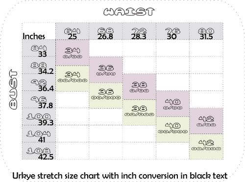 Since I know not everyone enjoys doing conversions, I converted Urkye's size chart to inches and added it to the chart. I hope Urkye won't mind (even though I work in metric, it's hard completely leaving behind the units you were raised with); but if they are uncomfortable with these images, I will remove them.